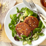 - 直径30cmのノンスティックフライパンにオリーブオイルを入れ、中火で熱し、鶏肉を調味料をまぶした面を下にして入れる。3分ほど焼き、こんがり色づいたら裏返す。